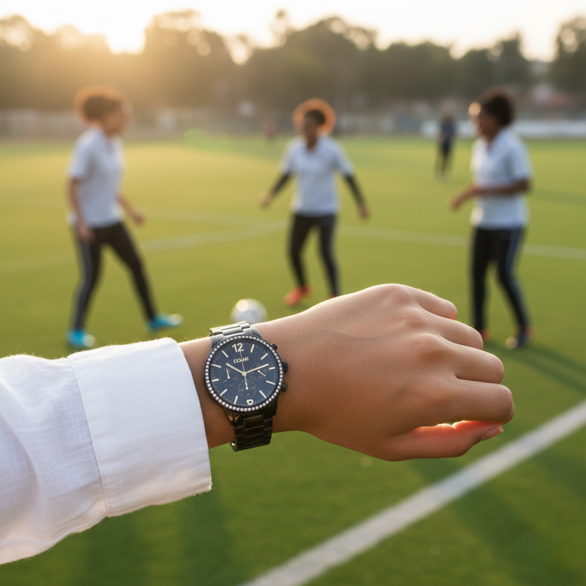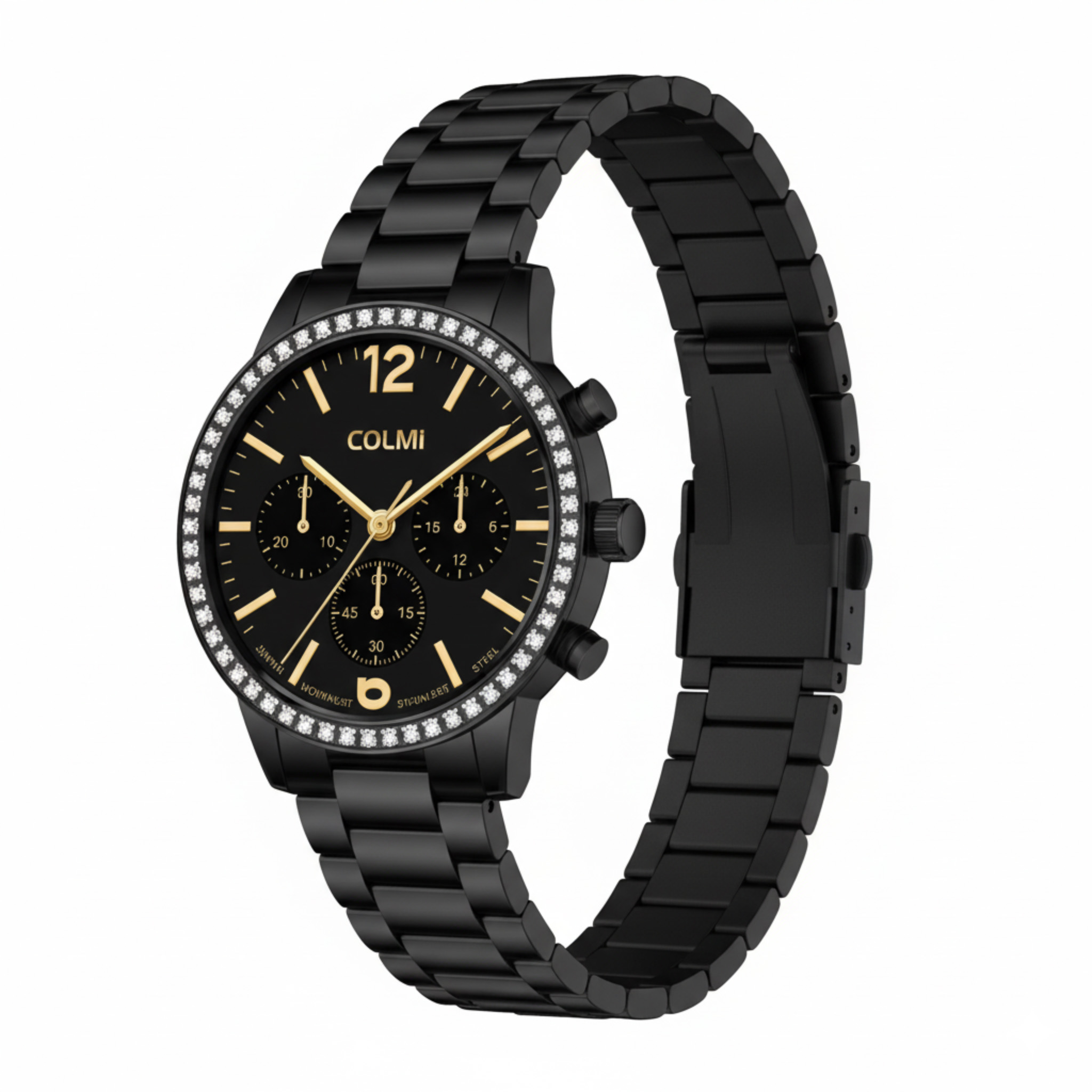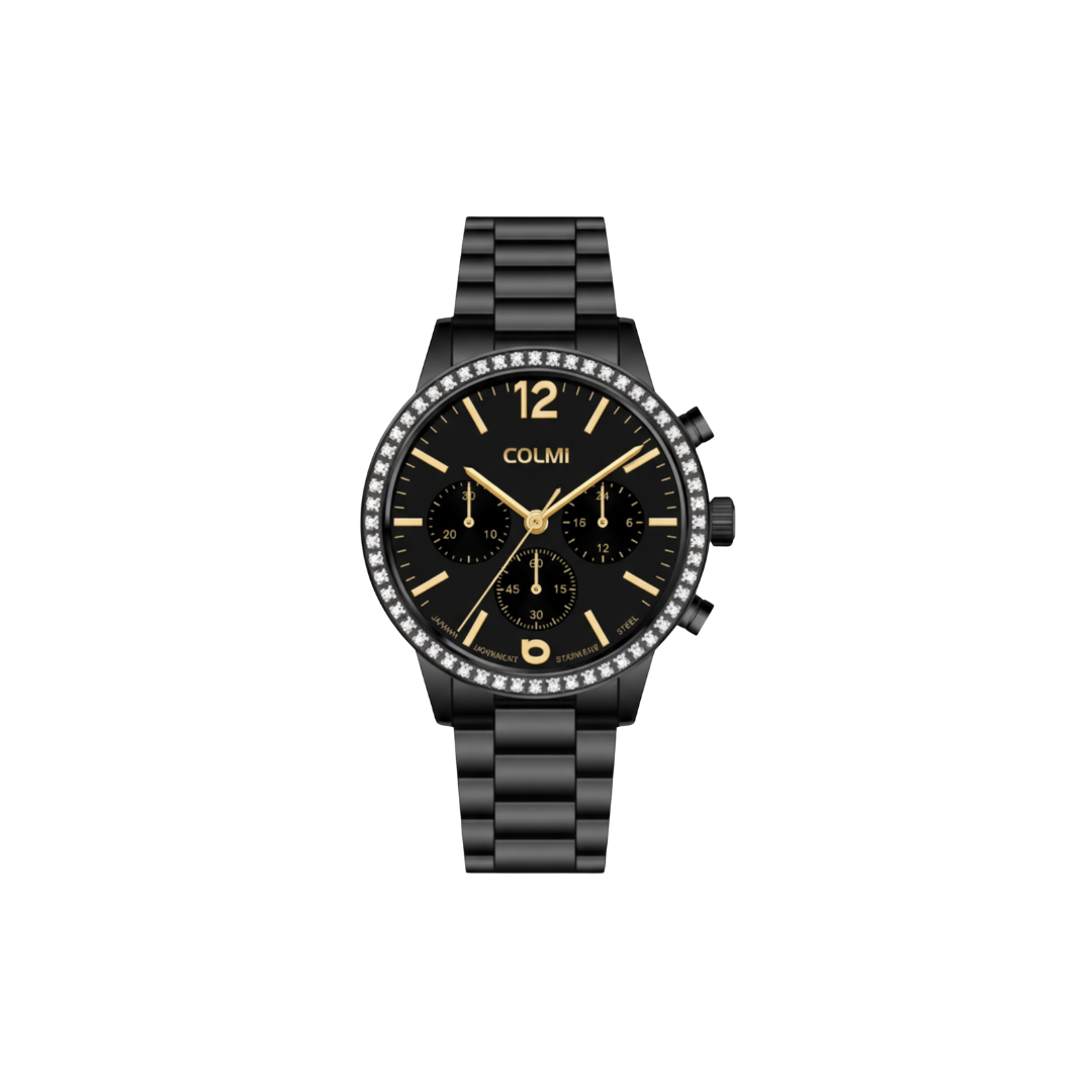 The Colmi CALYX Black commands attention with its bold, sport-luxury design. Its black stainless steel case is framed by a crystal-set bezel, creating a striking contrast against the deep black dial. Rose gold-tone hands, indexes, and numerals add warmth and sophistication, while three chronograph sub-dials deliver precise timekeeping functionality.
